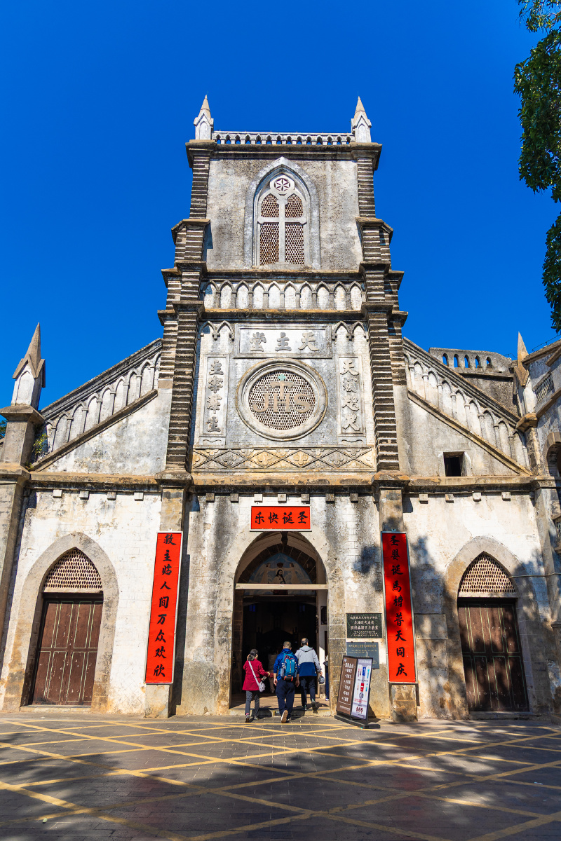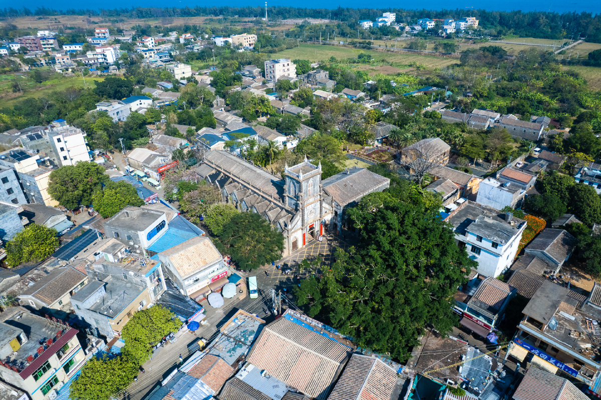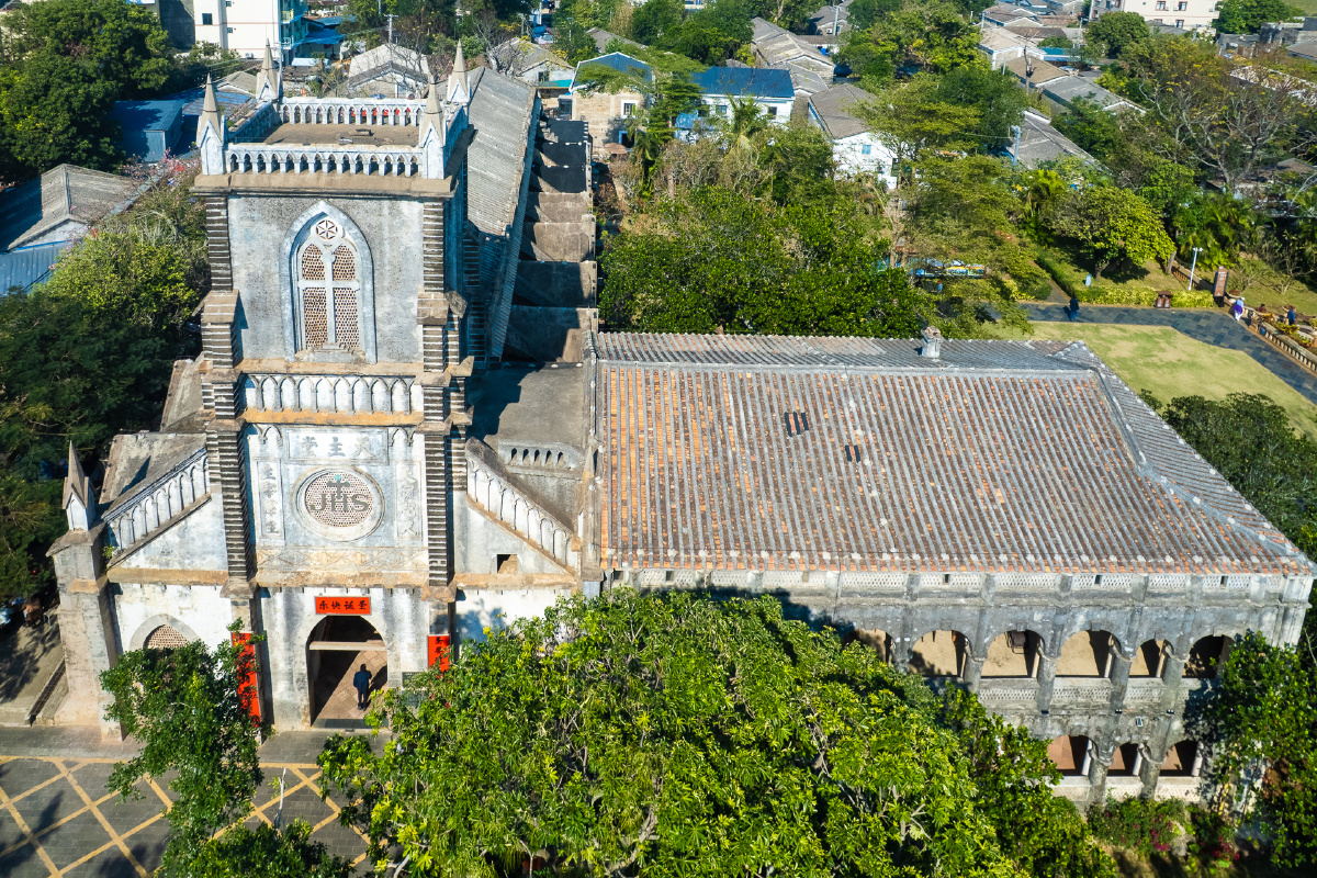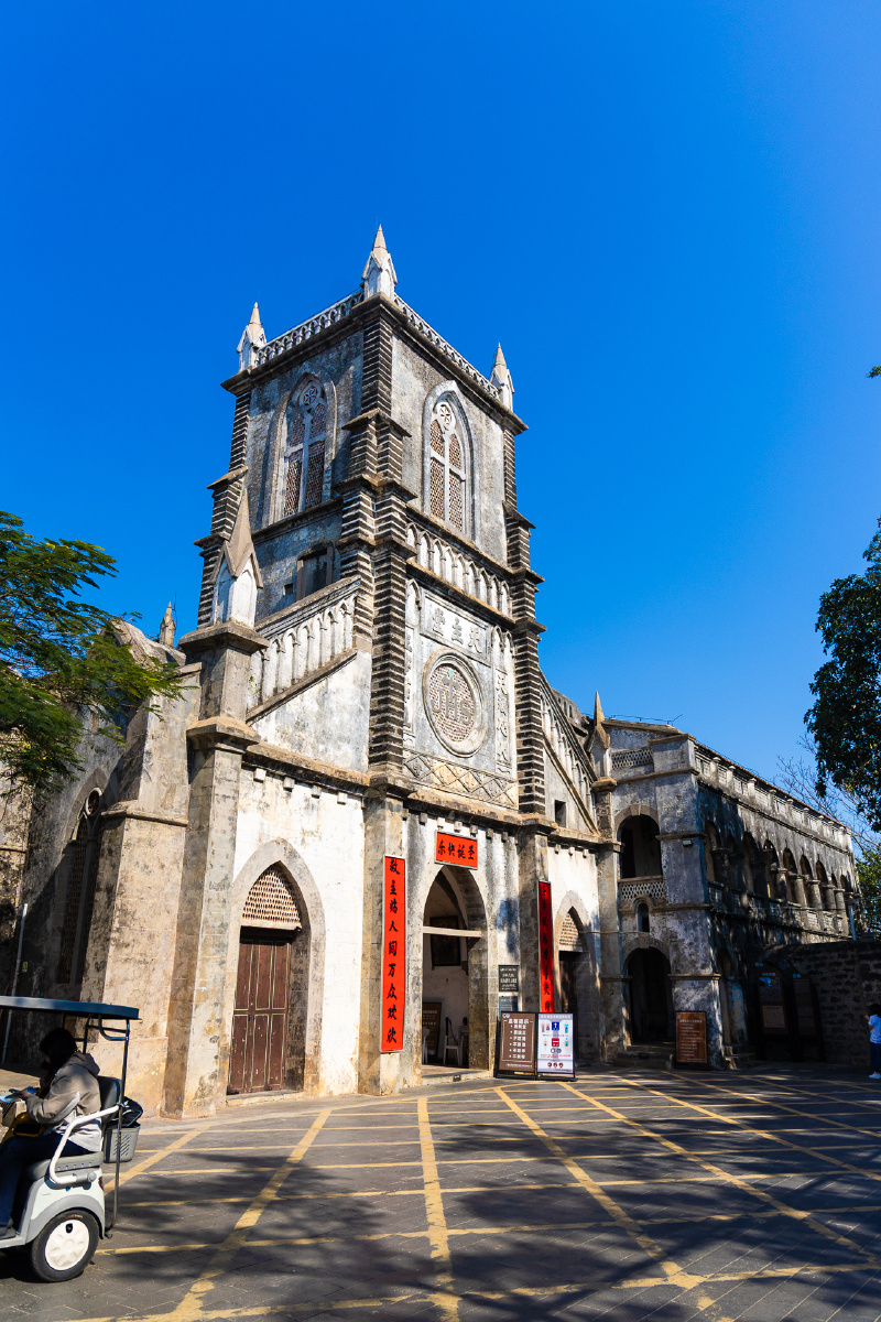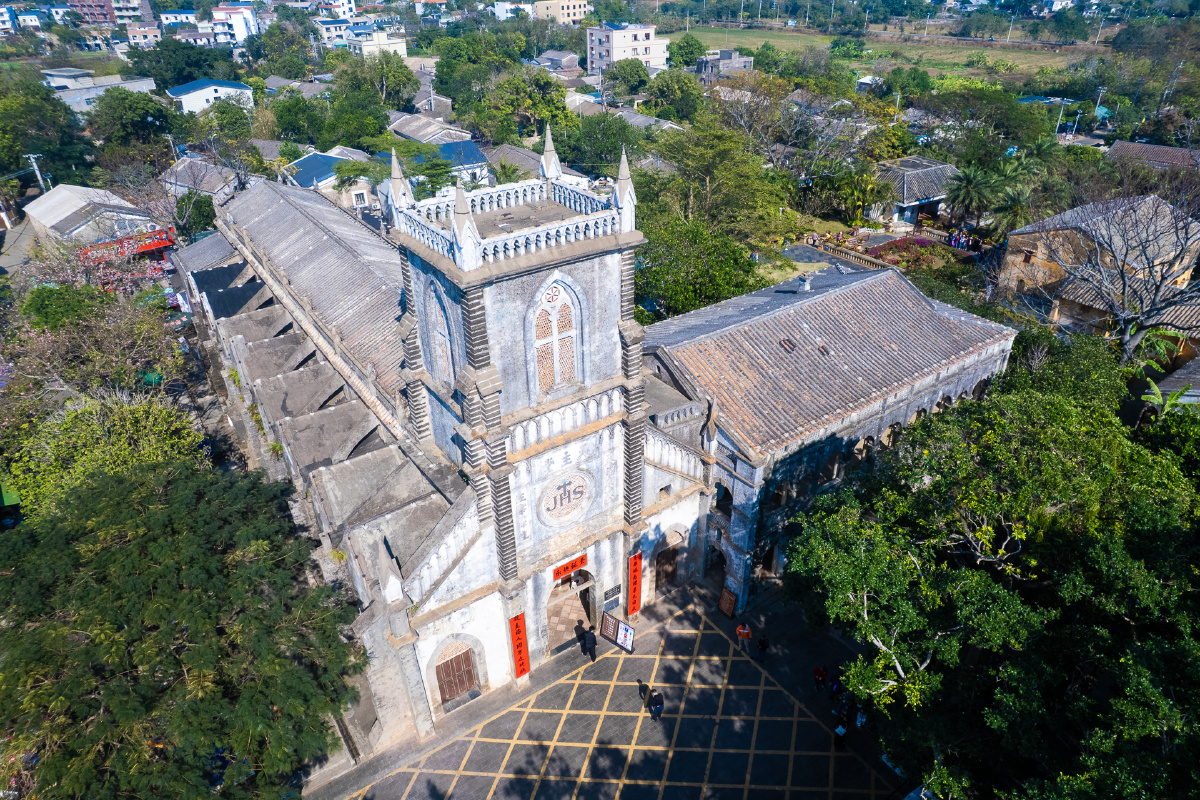 涠洲岛天主教堂位于广西北海市涠洲岛盛塘村,是一座法国哥特式建筑风格的天主教堂 。该教堂由法国巴黎外方传教会传教士修建,于1880年落成。教堂主体采用当地特有的珊瑚石、火山石等材料砌筑,楼高21米,总建筑面积774平方米 。其建造与清同治年间清政府对涠洲“重开岛禁”的历史背景有关。教堂是清末“雷廉”地区一座规模宏大的教堂,现为全国重点文物保护单位和国家4A级旅游景区 。它至今仍是宗教活动场所,村中多数居民信奉天主教。教堂常年对游客开放,开放时间为全年08:00-17:30。