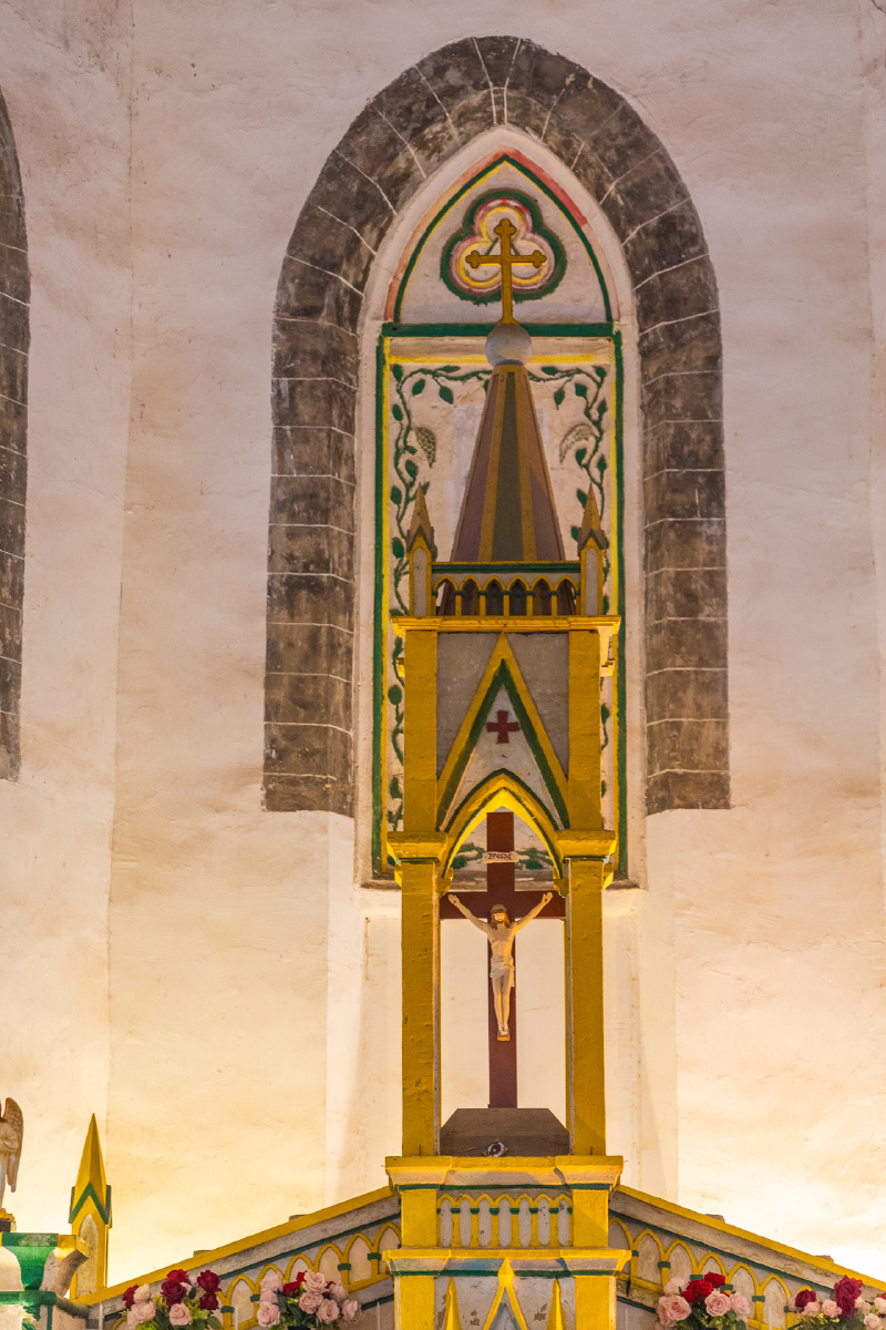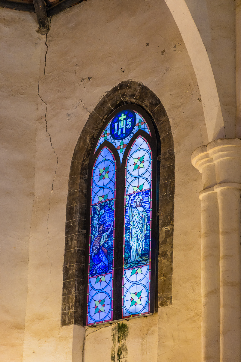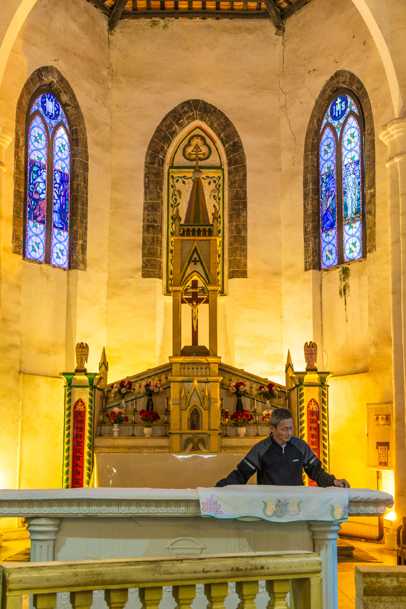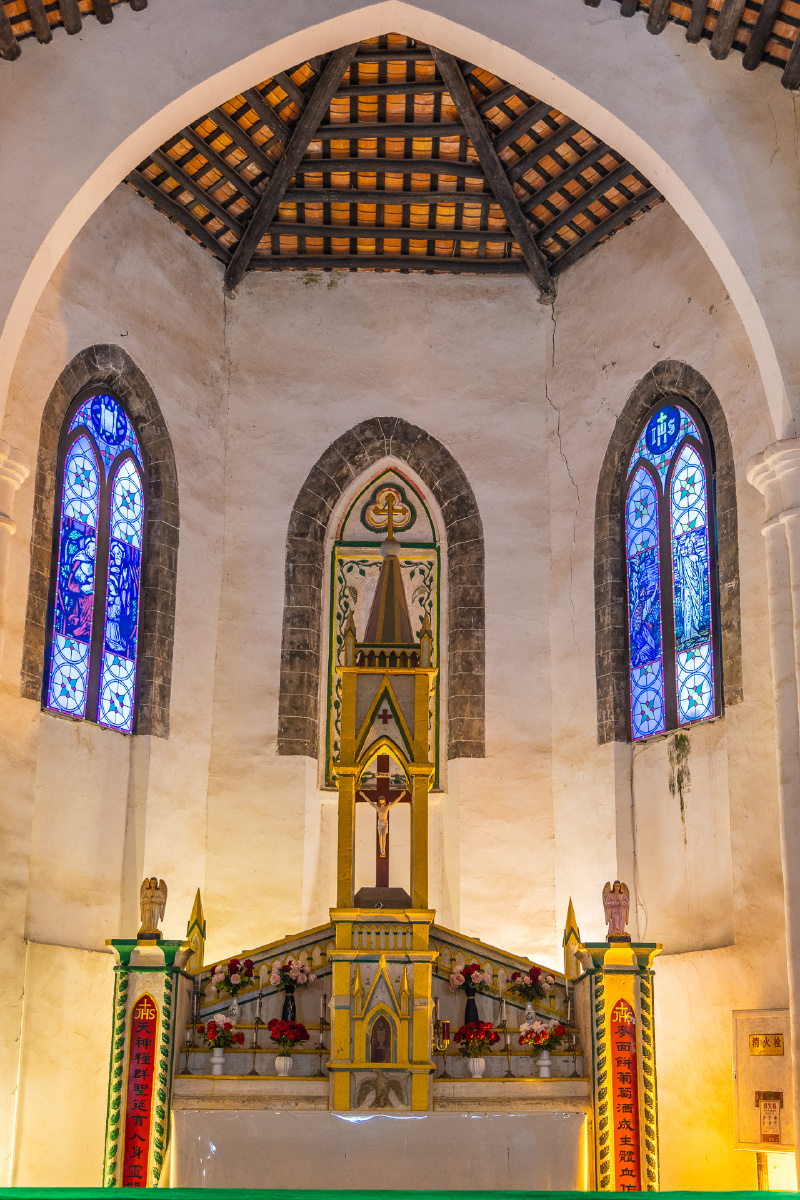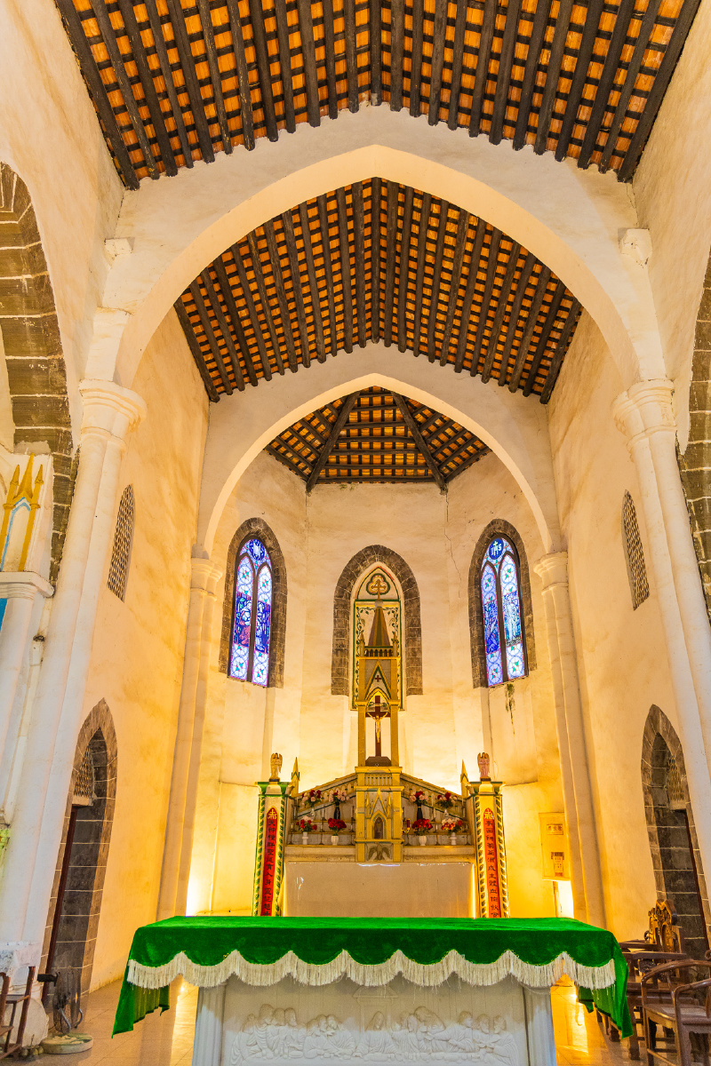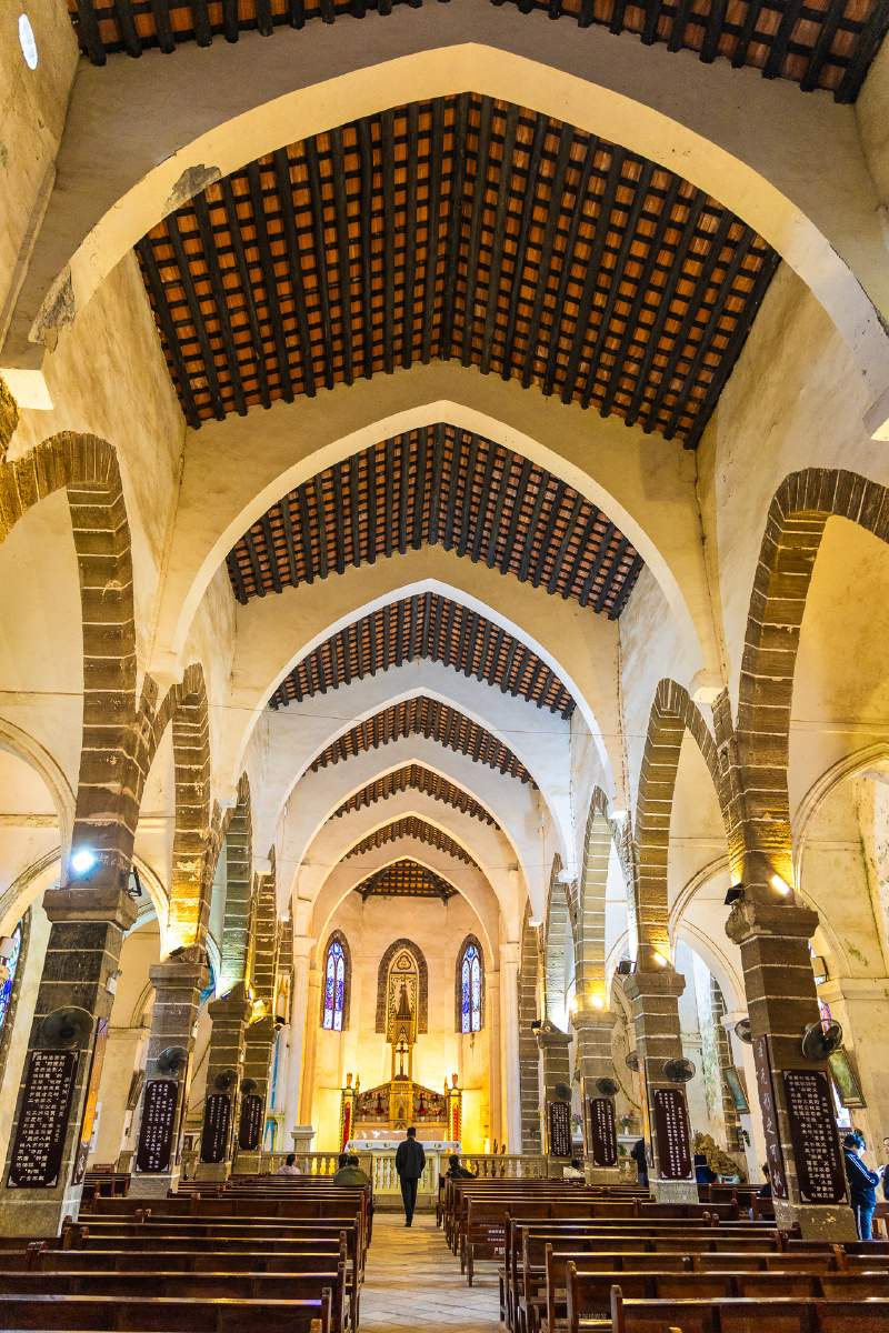 涠洲岛天主教堂位于广西北海市涠洲岛盛塘村,是一座法国哥特式建筑风格的天主教堂 。该教堂由法国巴黎外方传教会传教士修建,于1880年落成。教堂主体采用当地特有的珊瑚石、火山石等材料砌筑,楼高21米,总建筑面积774平方米 。其建造与清同治年间清政府对涠洲“重开岛禁”的历史背景有关。教堂是清末“雷廉”地区一座规模宏大的教堂,现为全国重点文物保护单位和国家4A级旅游景区 。它至今仍是宗教活动场所,村中多数居民信奉天主教。教堂常年对游客开放,开放时间为全年08:00-17:30。